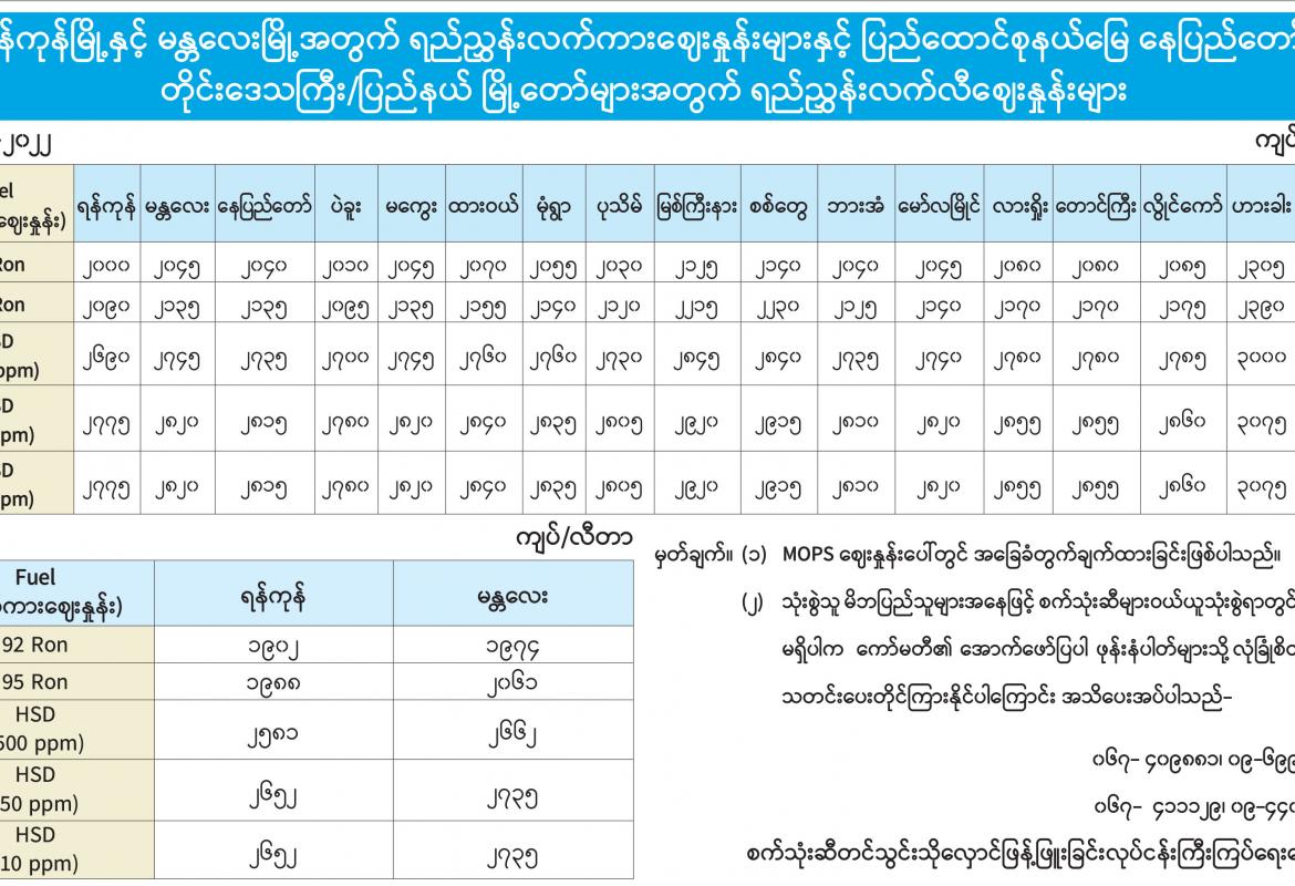 ရန်ကုန်မြို့နှင့် မန္တလေးမြို့အတွက် ရည်ညွှန်းလက်ကားဈေးနှုန်းများနှင့် ပြည်ထောင်စုနယ်မြေ နေပြည်တော်၊ တိုင်းဒေသကြီး/ ပြည်နယ် မြို့တော်များအတွက် ရည်ညွှန်းလက်လီဈေးနှုန်းများ