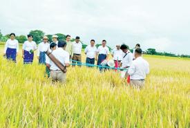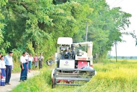 သန်လျင်မြို့နယ်၌ မျိုးစေ့ချကိရိယာဖြင့် စိုက်ပျိုးသော မိုးစပါးစံကွက်ရိတ်သိမ်း