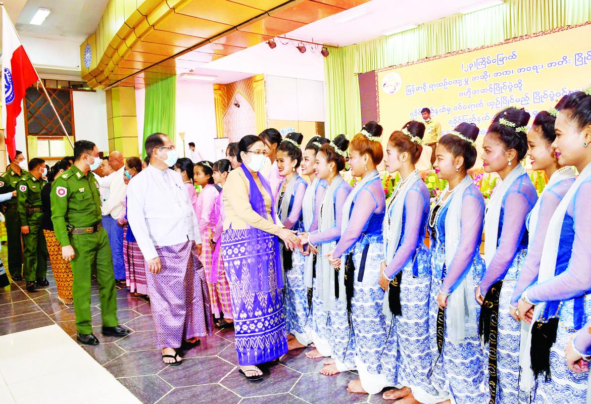 နိုင်ငံတော်စီမံအုပ်ချုပ်ရေးကောင်စီအဖွဲ့ဝင် ဒေါ်အေးနုစိန် (၂၃) ကြိမ်မြောက် မြန်မာ့ရိုးရာ အဆို၊ အက၊ အရေး၊ အတီးပြိုင်ပွဲတွင် ရခိုင်ပြည်နယ်မှ သွားရောက်ယှဉ်ပြိုင်မည့် ပြိုင်ပွဲဝင်များအား အောင်နိုင်ရေးအလံပေးအပ်ပွဲတက်ရောက်