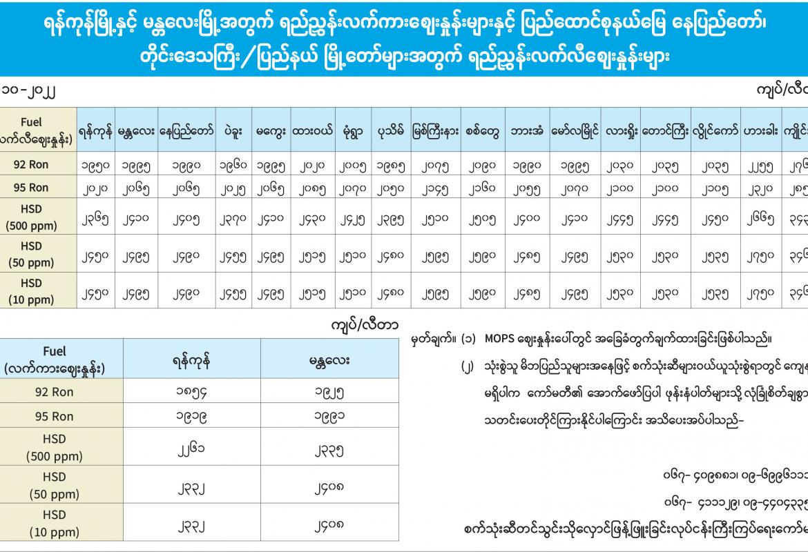 ရန်ကုန်မြို့နှင့် မန္တလေးမြို့အတွက် ရည်ညွှန်းလက်ကားဈေးနှုန်းများနှင့် ပြည်ထောင်စုနယ်မြေ နေပြည်တော်၊ တိုင်းဒေသကြီး/ပြည်နယ် မြို့တော်များအတွက် ရည်ညွှန်းလက်လီဈေးနှုန်းများ