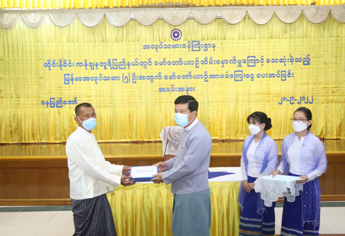 ထိုင်းနိုင်ငံ၊ ကန်ချနဘူရီပြည်နယ်တွင် မော်တော်ယာဉ်တိမ်းမှောက်မှုကြောင့် သေဆုံးခဲ့သည့် မြန်မာအလုပ်သမား (၅)ဦးအတွက် ကျန်ရစ်သူမိသားစုထံ အာမခံကြေးပေးအပ်