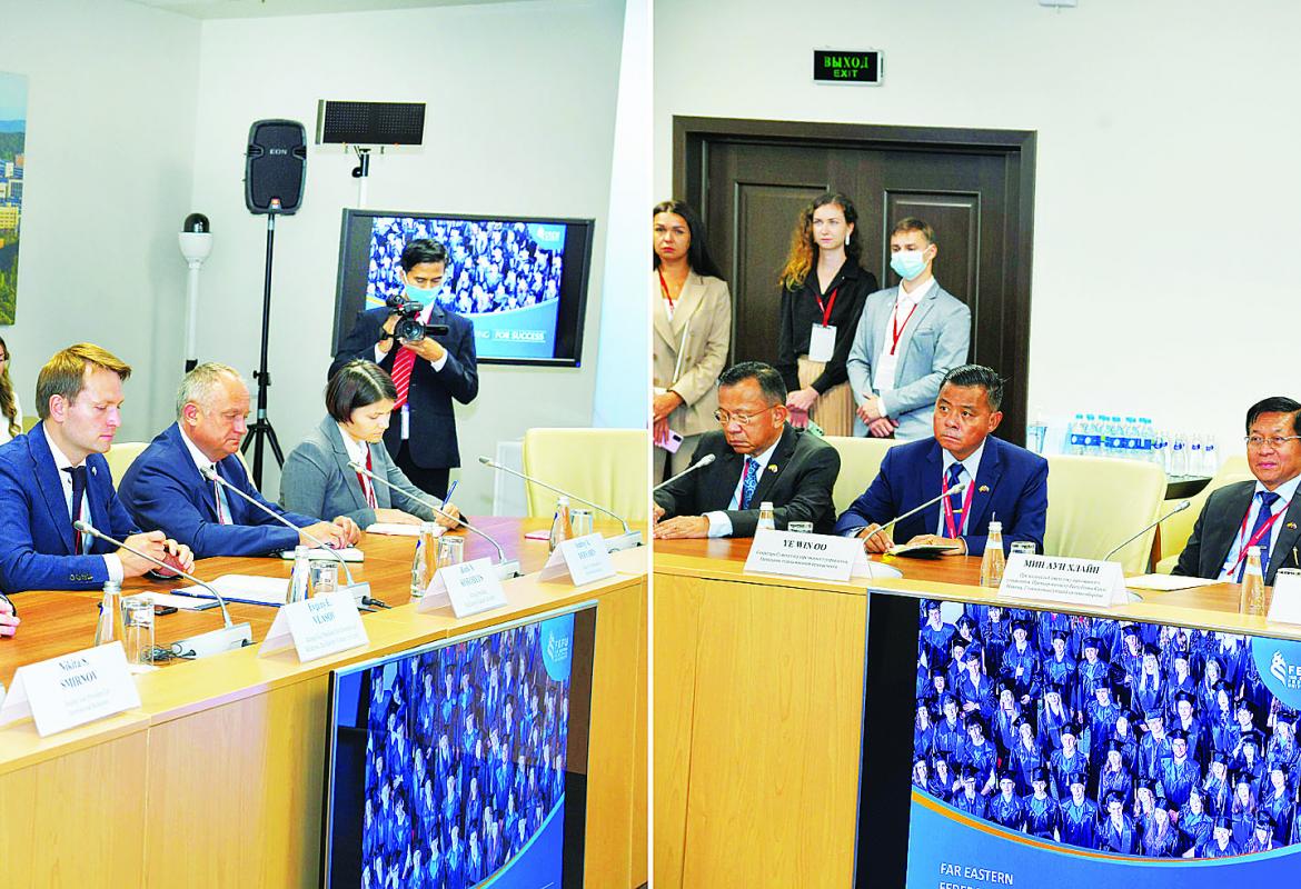 နိုင်ငံတော်စီမံအုပ်ချုပ်ရေးကောင်စီဥက္ကဋ္ဌ နိုင်ငံတော်ဝန်ကြီးချုပ် ဗိုလ်ချုပ်မှူးကြီး မင်းအောင်လှိုင် ရုရှားဖက်ဒ ရေးရှင်းနိုင်ငံ ဗလာဒီဗော့စတော့ခ်မြို့ Far Eastern Federal University (FEFU) တက္ကသိုလ် ပါမောက္ခချုပ်နှင့် တွေ့ဆုံဆွေးနွေး