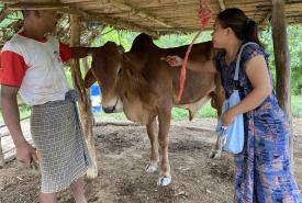 ငဖဲမြို့နယ် ဆင်ချည်တိုင်ကျေးရွာ၌ ပေါင်ပုပ်လက်ပုပ်ရောဂါ ကာကွယ်ဆေး ကွင်းဆင်းထိုးနှံပေးပြီး နွားခြံများအား ပိုးသတ်ဆေးများဖျန်း