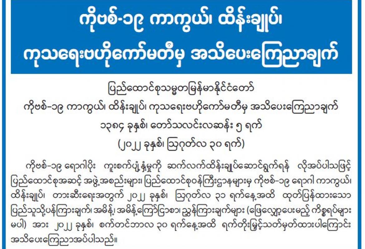 ကိုဗစ်-၁၉ ကာကွယ်၊ ထိန်းချုပ်၊ ကုသရေးဗဟိုကော်မတီမှ အသိပေးကြေညာချက်