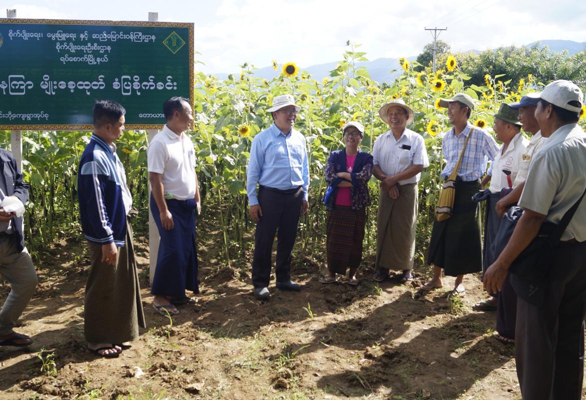 ရပ်စောက်မြို့နယ်တွင် နေကြာမျိုးစေ့ထုတ် စံပြစိုက်ခင်းအား ကွင်းဆင်းကြည့်ရှုစစ်ဆေး၍ တောင်သူများနှင့် စိုက်ပျိုးရေးနည်းပညာများ တိုင်ပင်ဆွေးနွေး