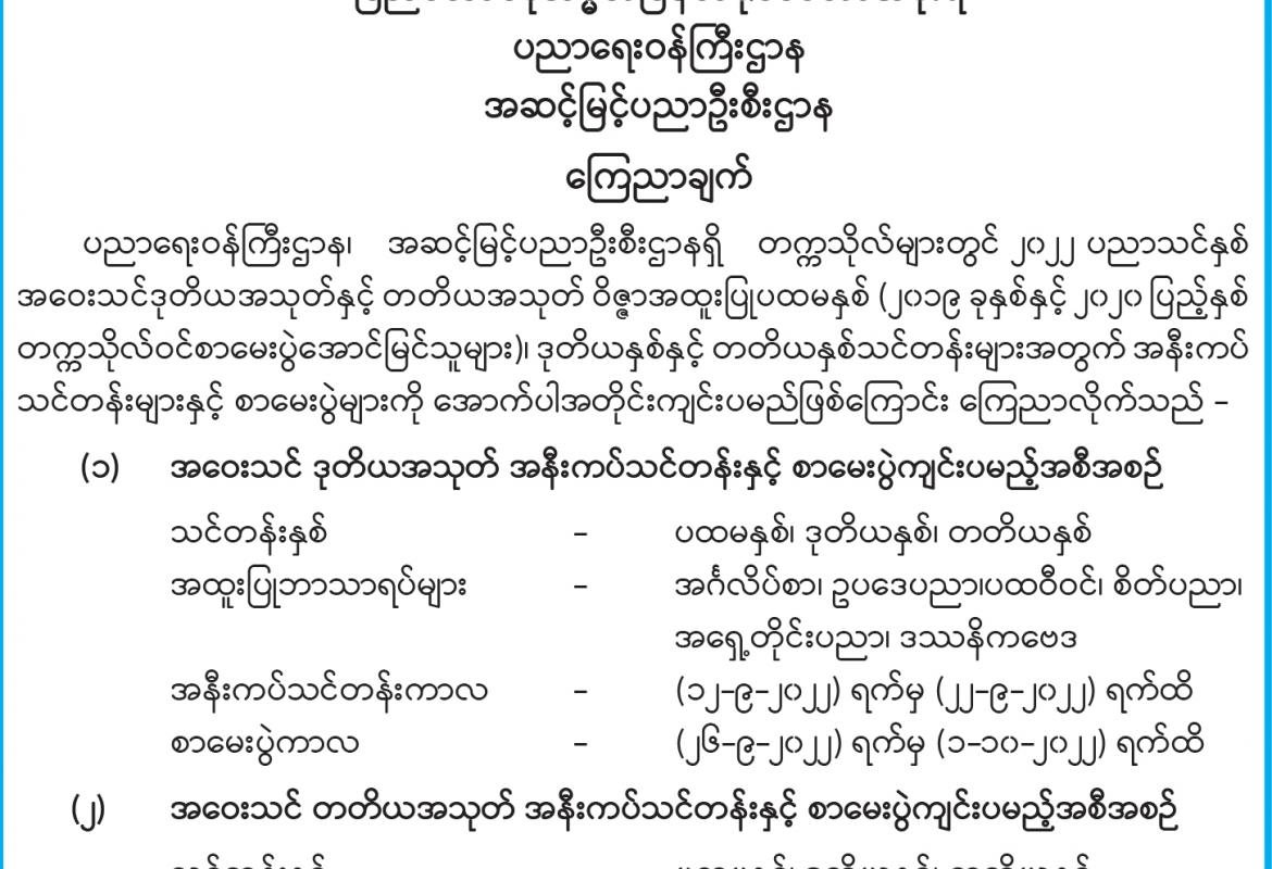 တက္ကသိုလ်ဝင်စာမေးပွဲ ဖြေဆိုခွင့်လျှောက်ထားခြင်းနှင့်ပတ်သက်၍ ဆောင်ရွက်မည့်အစီအစဉ် ထုတ်ပြန်ကြေညာ