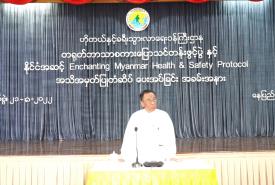 ပြည်ထောင်စုဝန်ကြီး ဒေါက်တာဌေးအောင် နေ့စဉ်သုံး အခြေခံတရုတ်ဘာသာစကားပြော သင်တန်းဖွင့်ပွဲနှင့် နိုင်ငံအဆင့် Enchanting Myanmar Health & Safety Protocols အသိအမှတ်ပြု တံဆိပ်ပေးအပ်ခြင်း အခမ်းအနားသို့ တက်ရောက် အမှာစကားပြောကြား