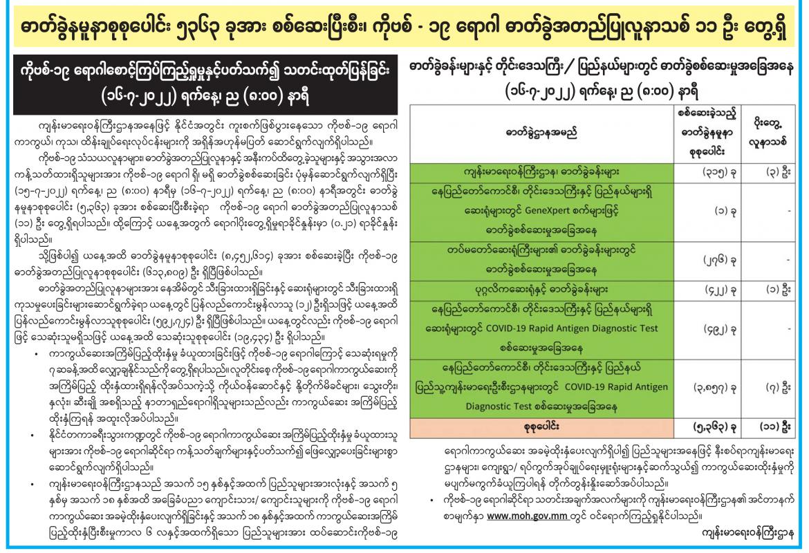 ဓာတ်ခွဲနမူနာစုစုပေါင်း ၅၃၆၃ ခုအား စစ်ဆေးပြီးစီး၊ ကိုဗစ်-၁၉ ရောဂါ ဓာတ်ခွဲအတည်ပြုလူနာသစ် ၁၁ ဦး တွေ့ရှိ