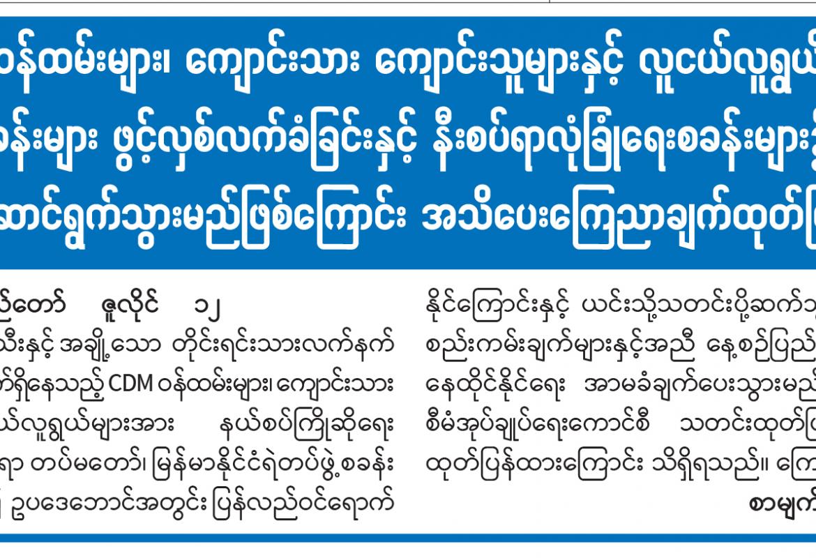 CDM ဝန်ထမ်းများ၊ ကျောင်းသား ကျောင်းသူများနှင့် လူငယ်လူရွယ်များအား ကြိုဆိုရေးစခန်းများ ဖွင့်လှစ်လက်ခံခြင်းနှင့် နီးစပ်ရာလုံခြုံရေးစခန်းများ၌ လက်ခံခြင်း ဆောင်ရွက်သွားမည်ဖြစ်ကြောင်း အသိပေးကြေညာချက်ထုတ်ပြန်