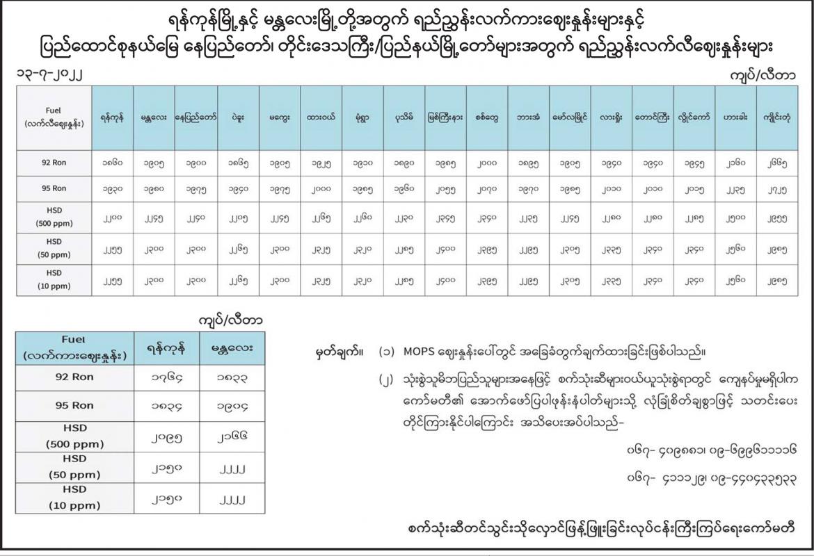 ရန်ကုန်မြို့နှင့် မန္တလေးမြို့တို့အတွက် ရည်ညွှန်းလက်ကားဈေးနှုန်းများနှင့် ပြည်ထောင်စုနယ်မြေ နေပြည်တော်၊ တိုင်းဒေသကြီး/ပြည်နယ်မြို့တော်များအတွက် ရည်ညွှန်းလက်လီဈေးနှုန်းများ