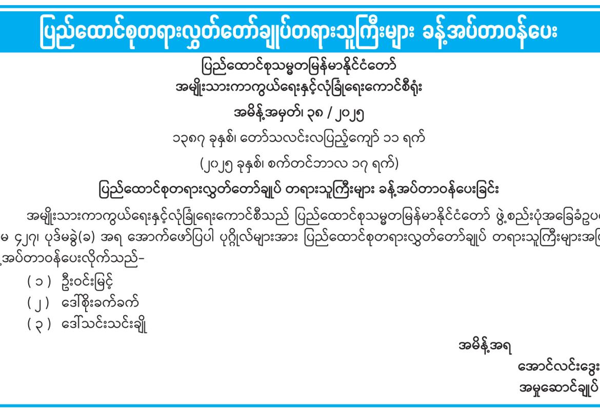 ပြည်ထောင်စုတရားလွှတ်တော်ချုပ်တရားသူကြီးများ ခန့်အပ်တာဝန်ပေး