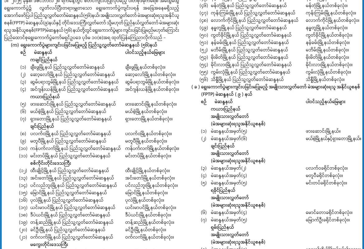ရွေးကောက်ပွဲများကျင်းပခြင်းမပြုမည့် ပြည်သူ့လွှတ်တော်မဲဆန္ဒနယ်၊ အမျိုးသားလွှတ်တော် မဲအများဆုံးရသူအနိုင်ယူစနစ် (FPTP) မဲဆန္ဒနယ်နှင့် တိုင်းဒေသကြီးလွှတ်တော် သို့မဟုတ် ပြည်နယ်လွှတ်တော် မဲအများဆုံးရသူအနိုင်ယူစနစ် (FPTP) မဲဆန္ဒနယ်များစာရင်း ထုတ်ပြန်ကြေညာ