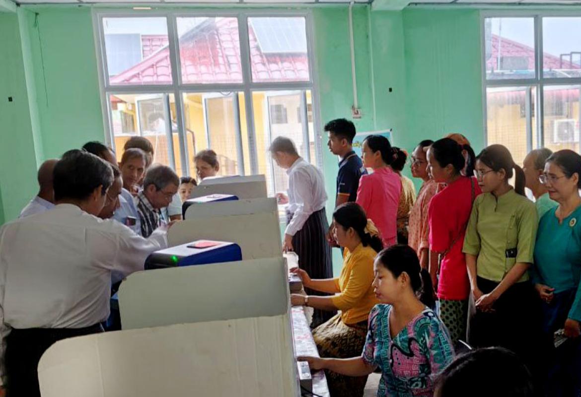 ပြည်ထောင်စုသမ္မတမြန်မာနိုင်ငံတော် ၂၀၂၅ ခုနှစ် ပါတီစုံဒီမိုကရေစီ အထွေထွေရွေးကောက်ပွဲ အပိုင်း(၂)တွင် ပါဝင်ဆန္ဒမဲပေးနေကြသည့် မဲဆန္ဒရှင်ပြည်သူများအား မဲရုံများအလိုက် လိုက်လံကြည့်ရှုအားပေး