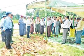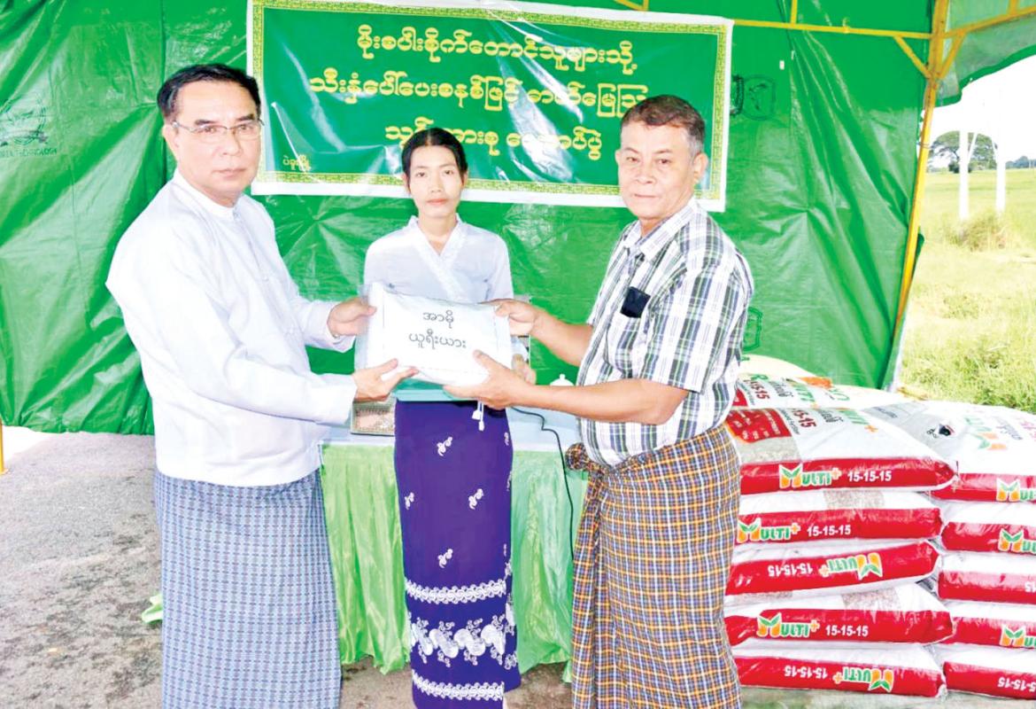 ပဲခူးတိုင်းဒေသကြီး ဝန်ကြီးချုပ် ပဲခူးမြို့နယ်ရှိ မိုးစပါးစိုက်တောင်သူများသို့ သီးနှံပေါ်ပေးစနစ်ဖြင့် ဈေးနှုန်းသက်သာသော ဓာတ်မြေဩဇာများ ပေးအပ်