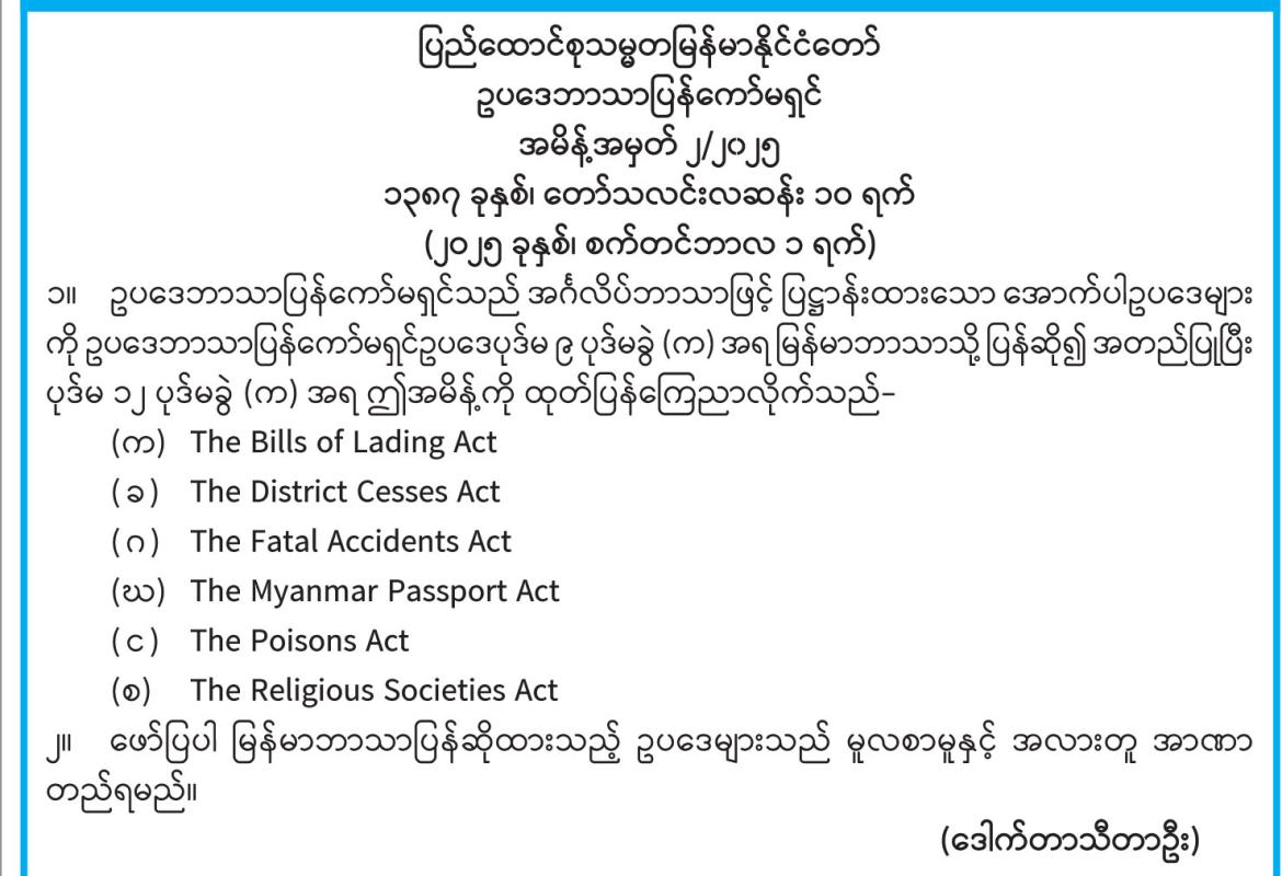 အင်္ဂလိပ်ဘာသာဖြင့် ပြဋ္ဌာန်းထားသောဥပဒေများ မြန်မာဘာသာသို့ ပြန်ဆိုအတည်ပြု
