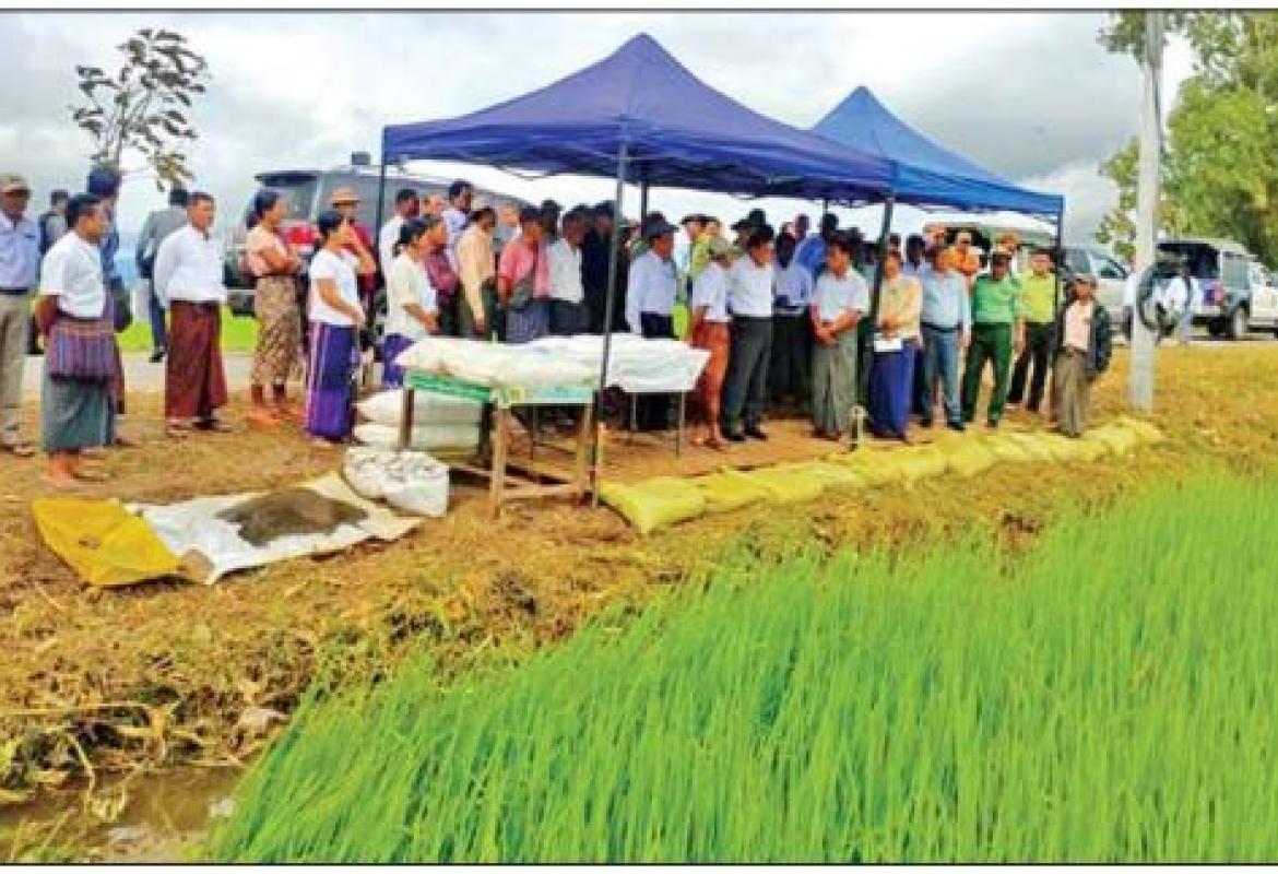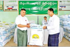 ပြည်ထောင်စုဝန်ကြီး ဦးလှမိုး မိုးစပါးစိုက်တောင်သူများသို့ သီးနှံပေါ်ပေးစနစ်ဖြင့် ဓာတ်မြေဩဇာသွင်းအားစု ပေးအပ်