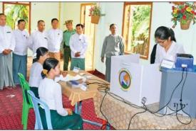 နေပြည်တော်ကောင်စီဥက္ကဋ္ဌ ဦးသန်းထွန်းဦး မြန်မာအီလက်ထရောနစ်မဲပေးစက်ဖြင့် လက်တွေ့စမ်းသပ်မဲပေးနေမှု ကြည့်ရှုအားပေး