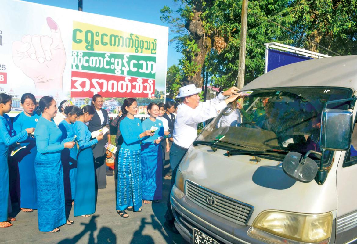 ရခိုင်ပြည်နယ်ဝန်ကြီးချုပ် “ဒို့အတူတူ မဲပေးကြမယ်” အသိပညာပေးလက်ကမ်းစာစောင်များ ပြည်သူများအား ဖြန့်ဝေပေး