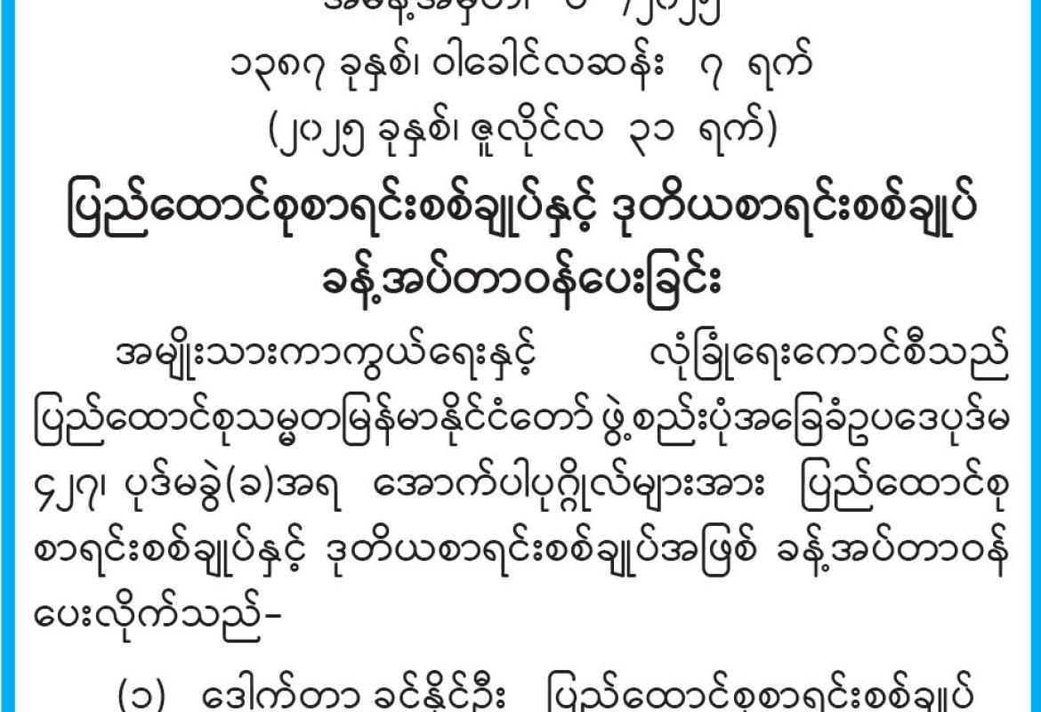 ပြည်ထောင်စုစာရင်းစစ်ချုပ်နှင့် ဒုတိယစာရင်းစစ်ချုပ် ခန့်အပ်တာဝန်ပေး