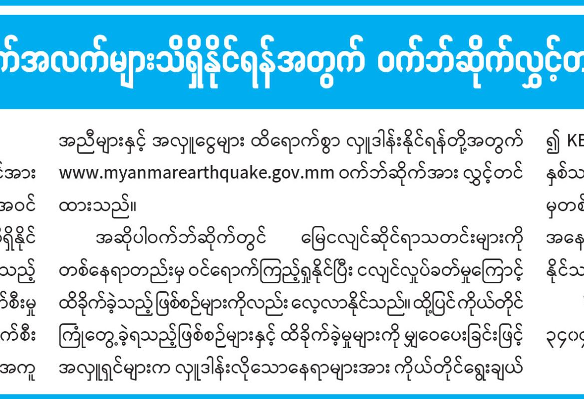 ၂၀၂၅ မန္တလေးငလျင်ဆိုင်ရာ အချက်အလက်များသိရှိနိုင်ရန်အတွက် ဝက်ဘ်ဆိုက်လွှင့်တင်ထားရှိကြောင်း အသိပေးကြေညာ