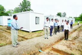 ပြည်ထောင်စုဝန်ကြီး ဦးကျော်စိုးဝင်း ငလျင်ဒဏ်သင့် ဝန်ထမ်းများနှင့် မိသားစုဝင်များ နေထိုင်လျက်ရှိသည့် ယာယီအဆောက်အအုံများ ကြည့်ရှုစစ်ဆေး