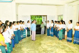 ပြည်ထောင်စုဝန်ကြီး ဦးမောင်မောင်အုန်း အပြာရောင်အဆင့်သတ်မှတ်ထားသည့် အပျိုဆောင် များ၌ ဝန်ထမ်းများပြန်လည်နေထိုင်နေမှုအခြေအနေ ကြည့်ရှုစစ်ဆေးအားပေး