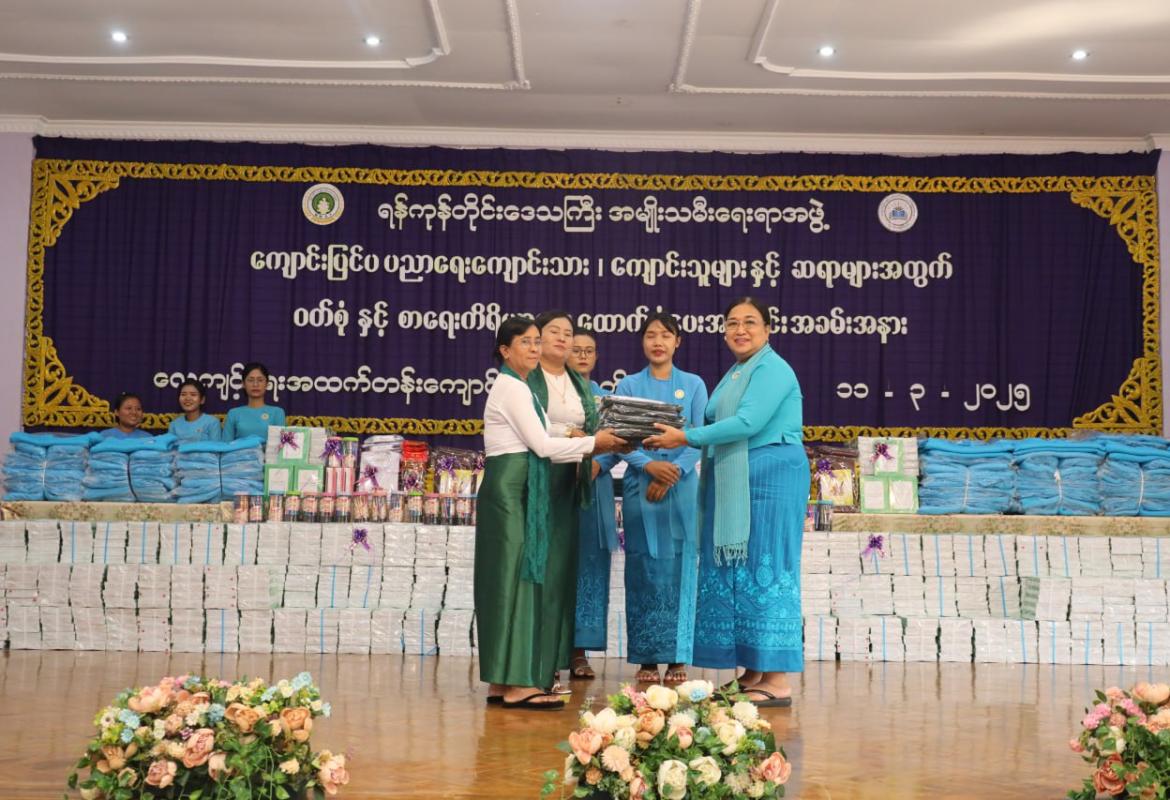 ရန်ကုန်တိုင်းဒေသကြီးအမျိုးသမီးရေးရာအဖွဲ့မှ ကျောင်းပြင်ပပညာရေး ကျောင်းသား/သူများနှင့် ဆရာများအတွက် ဝတ်စုံနှင့်စာရေးကိရိယာများ ထောက်ပံ့ပေးအပ်ခြင်း အခမ်းအနား ကျင်းပ