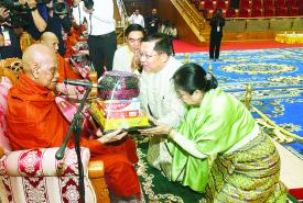 ၂၀၂၅ ခုနှစ်၊ သာသနာတော်ဆိုင်ရာ ဘွဲ့တံဆိပ်တော် ဆက်ကပ်ခံယူတော်မူမည့် ဆရာတော်ကြီးများအား နိုင်ငံတော် စီမံအုပ်ချုပ်ရေးကောင်စီဥက္ကဋ္ဌ နိုင်ငံတော်ဝန်ကြီးချုပ် ဗိုလ်ချုပ်မှူးကြီး မင်းအောင်လှိုင်နှင့်ဇနီး ဒေါ် ကြူကြူလှတို့ နေ့ဆွမ်းဆက်ကပ်လှူဒါန်း