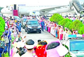 နိုင်ငံတော် စီမံအုပ်ချုပ်ရေးကောင်စီဥက္ကဋ္ဌ နိုင်ငံတော်ဝန်ကြီးချုပ် ဗိုလ်ချုပ်မှူးကြီး မင်းအောင်လှိုင် ဦးဆောင်သည့် မြန်မာအဆင့်မြင့် ကိုယ်စားလှယ်အဖွဲ့အား ပြည်သူများက သောင်းသောင်းဖြဖြ ကြိုဆိုဂုဏ်ပြုနှုတ်ဆက်