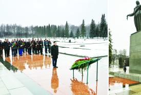 နိုင်ငံတော်စီမံအုပ်ချုပ်ရေးကောင်စီဥက္ကဋ္ဌ နိုင်ငံတော်ဝန်ကြီးချုပ် ဗိုလ်ချုပ်မှူးကြီး မင်းအောင်လှိုင် စိန့်ပီတာစဘတ်မြို့ရှိ Piskaryovskoye Memorial Cemetery ၌ လွမ်းသူ့ပန်းခွေချအလေးပြု