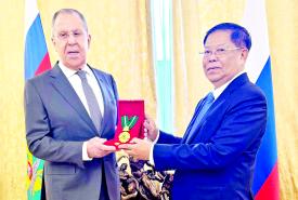 ရုရှားဖက်ဒရေးရှင်းနိုင်ငံ နိုင်ငံခြားရေးဝန်ကြီး မစ္စတာဆာဂျီဗစ်တရာဗစ်ချ်လတ်ဗ်ရော့အား ပေးအပ်ချီးမြှင့်သည့် စည်သူဘွဲ့အား ဒုတိယဝန်ကြီးချုပ်နှင့် နိုင်ငံခြားရေးဝန်ကြီးဌာန ပြည်ထောင်စုဝန်ကြီး ဦးသန်းဆွေက ချီးမြှင့်အပ်နှင်း
