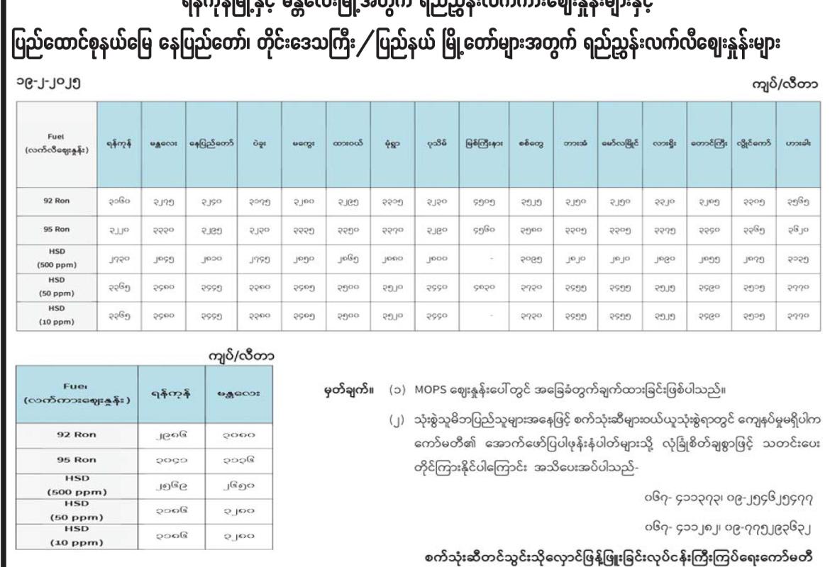 ရန်ကုန်မြို့နှင့် မန္တလေးမြို့အတွက် ရည်ညွှန်းလက်ကားဈေးနှုန်းများနှင့် ပြည်ထောင်စုနယ်မြေ နေပြည်တော်၊ တိုင်းဒေသကြီး/ပြည်နယ် မြို့တော်များအတွက် ရည်ညွှန်းလက်လီဈေးနှုန်းများ