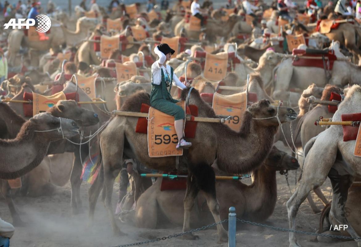 တရုတ်နိုင်ငံအနောက်မြောက်ပိုင်း ဂန်ဆူပြည်နယ် ဒန်ဟောင်တွင် ကမ္ဘာလှည့်ခရီးသွားများ ကုလားအုတ်များဖြင့် သဲသောင်များပေါ်တွင် ဖြတ်သွားနေကြပုံ