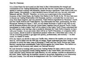 အမေရိကန်သမ္မတ ဒေါ်နယ်ထရမ့်က မြန်မာနိုင်ငံအပါအဝင် နိုင်ငံ ၁၄ နိုင်ငံအား သွင်းကုန်ခွန်တိုးမြှင့်စည်းကြပ်ထားမှုနှင့်ပတ်သက်၍ သက်ဆိုင်ရာနိုင်ငံများသို့ သဝဏ်လွှာ/အကြောင်းကြားစာများ ပေးပို့