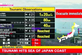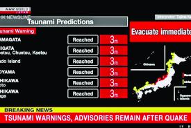 ဂျပန်နိုင်ငံ၌ အင်အားပြင်းငလျင်လှုပ်ပြီးနောက် အိုရှိခဝါ၊ တိုယာမာနှင့် နီးဂါတာ စီရင်စုတို့တွင် ဆူနာမီဖြစ်ပွား