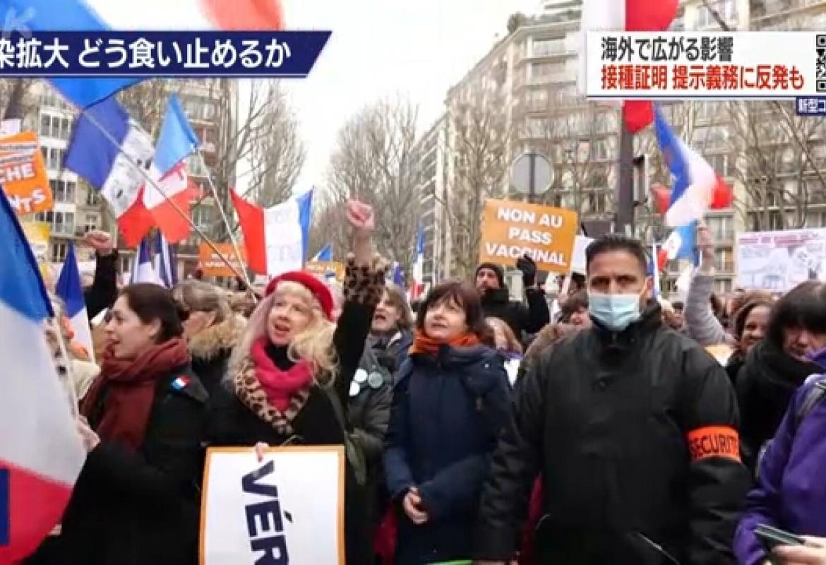 အများပြည်သူဆိုင်ရာနေရာများ၌ ကိုဗစ်-၁၉ ရောဂါ ကာကွယ်ဆေးထိုးနှံပြီးကြောင်း ပြသရမည်ဟူသော စည်းမျဉ်းနှင့်ပတ်သက်၍ ထောင်ချီရှိသောလူများ ပဲရစ်မြို့၏လမ်းများပေါ်သို့ထွက်ကာ ကန့်ကွက် ဆန္ဒပြခဲ့ကြသည်။