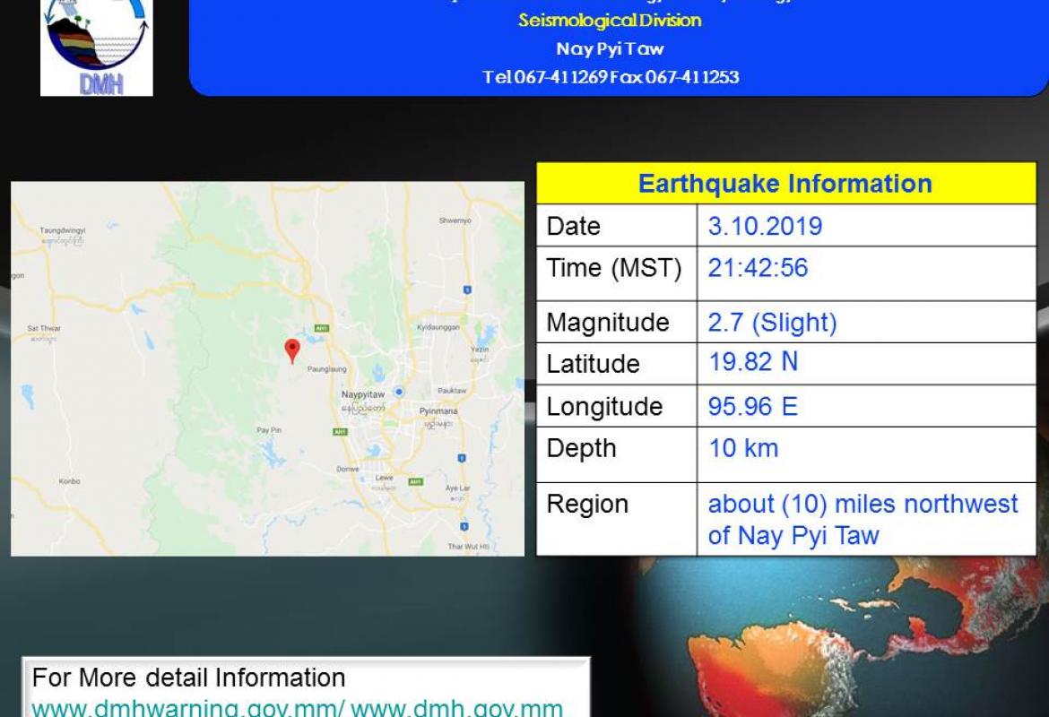 နေပြည်တော်မြေငလျင်စခန်းမှ အနောက်မြောက်ဘက် (၁၀)မိုင် ခန့်ကွာဝေးသော မြန်မာနိုင်ငံ ပြည်တွင်း အနက်(၁၀)ကီလိုမီတာကို ဗဟိုပြု၍ အင်အားရစ်(ခ်)တာစကေး (၂.၇) အဆင့်ရှိ အင်အားအနည်းငယ်ရှိသော မြေငလျင်တစ်ခု လှုပ်ရှားခဲ့သည်။