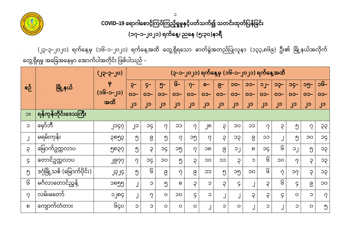 (၂၃-၃-၂၀၂၀) ရက်နေ့မှ (၁၆-၁-၂၀၂၁) ရက်နေ့အထိ တွေ့ရှိရသော ဓာတ်ခွဲအတည်ပြုလူနာ (၁၃၃,၈၆၉) ဦး၏ မြို့နယ်အလိုက် တွေ့ရှိရမှု အခြေအနေမှာ အောက်ပါအတိုင်း ဖြစ်ပါသည်။