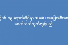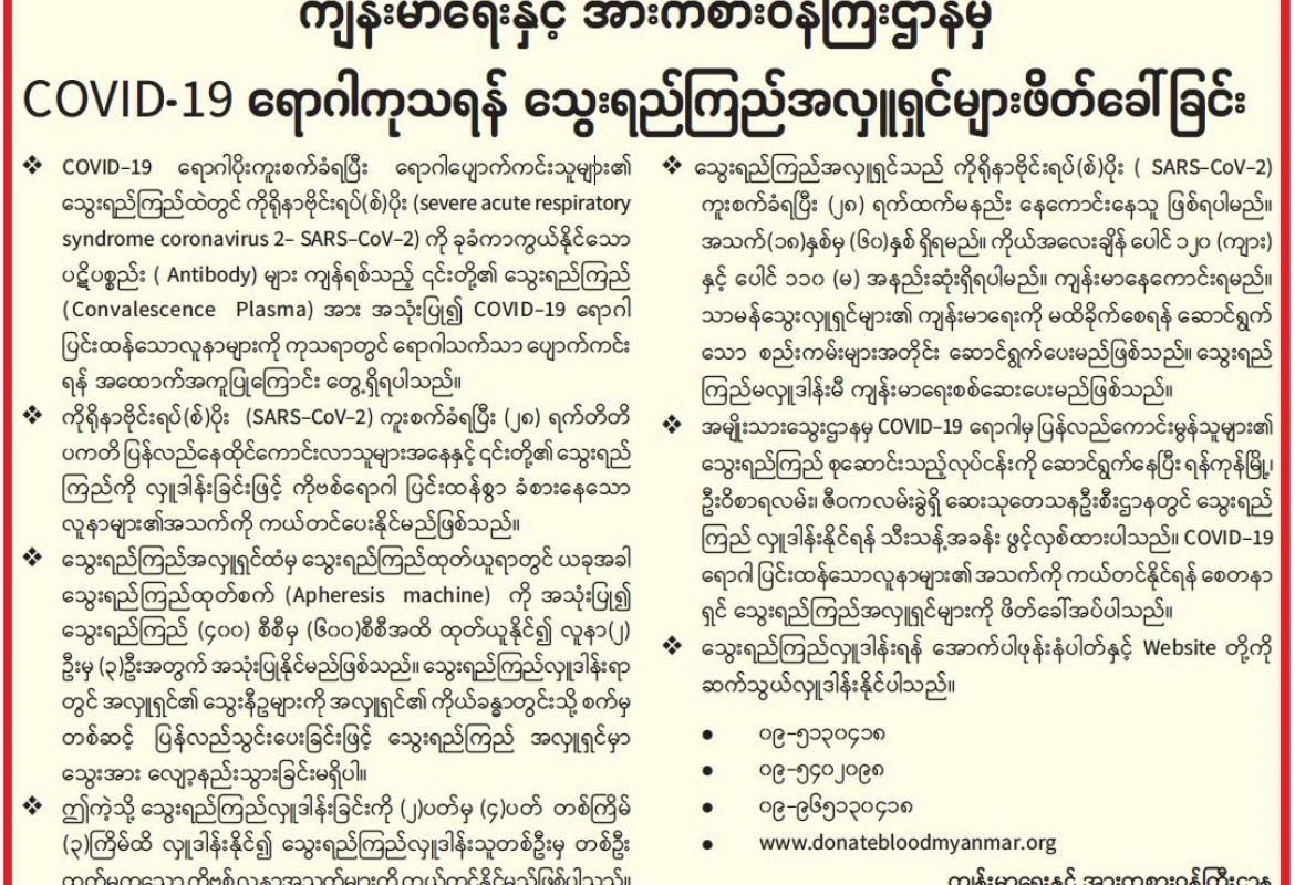 ကျန်းမာရေးနှင့် အားကစားဝန်ကြီးဌာနနှင့် ပြန်ကြားရေးဝန်ကြီးဌာနတို့ ပူးပေါင်းပြီး ကိုဗစ်-၁၉ ရောဂါအကြောင်း သိကောင်းစရာ အမေး/အဖြေ အစီအစဉ်ကို စက်တင်ဘာ ၂၉ ရက်မှစ၍ အပတ်စဉ် အင်္ဂါ၊ ဗုဒ္ဓဟူးနှင့် ကြာသပတေးနေ့များတွင် ညနေ ၆ နာရီခွဲ မှ ည ၇ နာရီအထိ မြန်မာ့အသံနှင့် ရုပ်မြင်သံကြားတွင် ထုတ်လွှင့်ပြသလျက်ရှိ.....