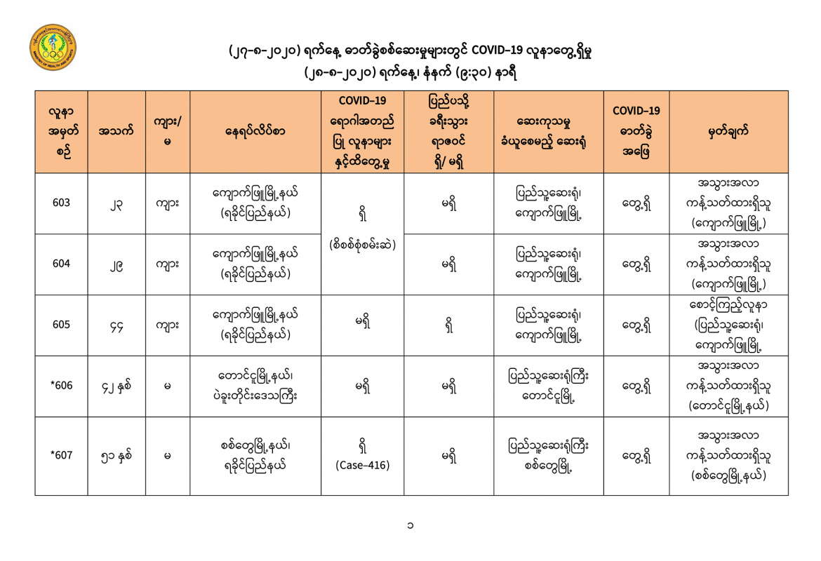 မန္တလေးတိုင်းဒေသကြီး၊ ညောင်ဦးမြို့ ကုတင် -၂၅ ဆံ တိုင်းရင်းဆေးရုံ၌ Quarantine ထားရှိသူများမှ Swab စစ်ဆေးရန် ကျန်ရှိသည့်စောင့်ကြည့်လူ ခြောက်ဦး၏ နှာခေါင်းတို့ဖတ်၊ အာခေါင်တို့ဖတ်တို့အား ယမန်နေ့နံနက် ၈ နာရီခွဲအချိန်က မန္တလေးမြို့သို့ စစ်ဆေးနိုင်ရန် ပို့ဆောင်ပေးခဲ့ကြောင်း