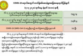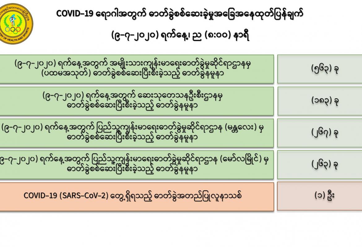 ၁။ (၉-၇-၂၀၂၀) ရက်နေ့အတွက် COVID-19 ရောဂါ ဓာတ်ခွဲစစ်ဆေးရာတွင် အမျိုးသားကျန်းမာရေး ဓာတ်ခွဲမှုဆိုင်ရာဌာန (ရန်ကုန်) (NHL)မှ (ပထမအသုတ်) ဓာတ်ခွဲနမူနာ (၅၆၃)ခု၊ ဆေးသုတေသနဦးစီးဌာန (DMR)မှ ဓာတ်ခွဲနမူနာ (၁၈၃) ခု၊ ပြည်သူ့ကျန်းမာရေးဓာတ်ခွဲမှုဆိုင်ရာဌာန (မန္တလေး) (PHL, Mandalay) မှ ဓာတ်ခွဲနမူနာ (၂၆၇) ခုနှင့် ပြည်သူ့ကျန်းမာရေးဓာတ်ခွဲမှုဆိုင်ရာဌာန (မော်လမြိုင်) (PHL, Mawlamyine) မှ ဓာတ်ခွဲနမူနာ (၂၆၃) ခု စုစုပေါင်း (၁,၂၇၆)ခု အား ယနေ့၊ ညနေတွင် စစ်ဆေးပြီးစီးခဲ့ရာ-