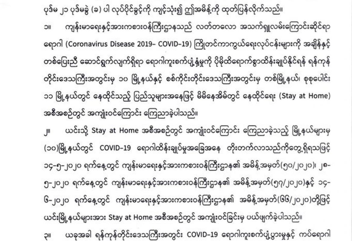 အင်းစိန်မြို့နယ်တွင်နေထိုင်သည့် ပြည်သူများအနေဖြင့် Stay at Home အစီအစဉ်တွင် အကျုံးဝင်ခြင်းမှ ဇူလိုင်လ ၁ ရက်နေ့တွင် ပယ်ဖျက်ကြောင်း ကျန်းမာရေးနှင့်အားကစားဝန်ကြီးဌာနမှ ထုတ်ပြန်