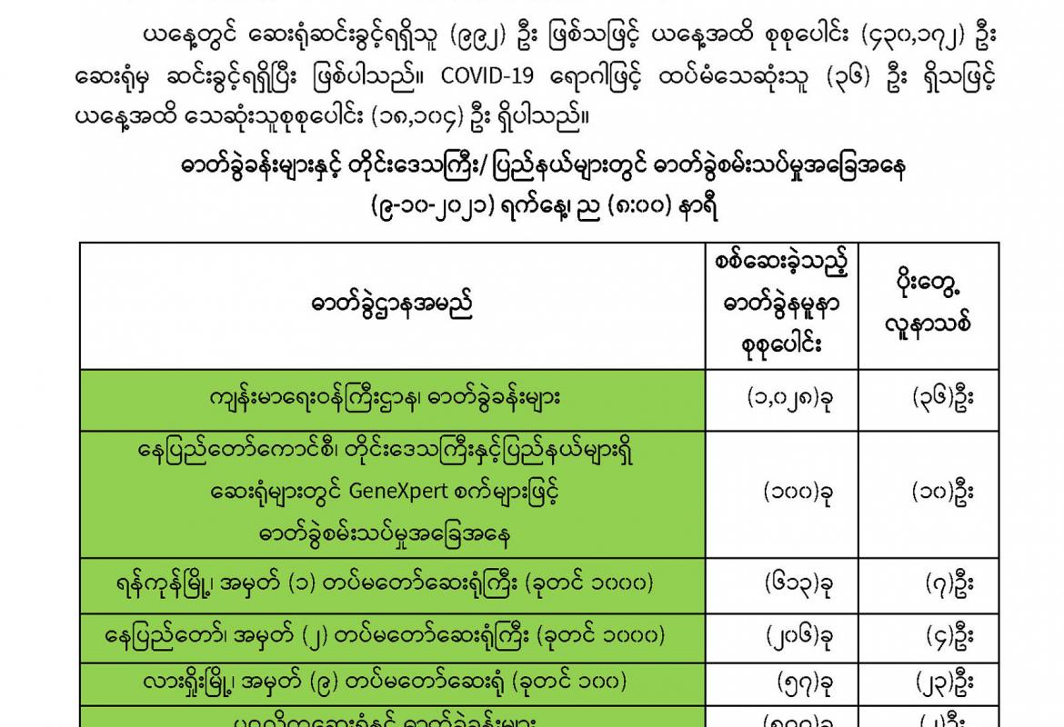အောက်တိုဘာ ၉ ရက် ည ၈ နာရီ ထုတ်ပြန်ချက်အရ ကိုဗစ်-၁၉ ရောဂါ ဓာတ်ခွဲအတည်ပြုလူနာသစ် ၁၄၄၈ ဦးတွေ့ရှိပြီး ၃၆ ဦး ထပ်မံသေဆုံး