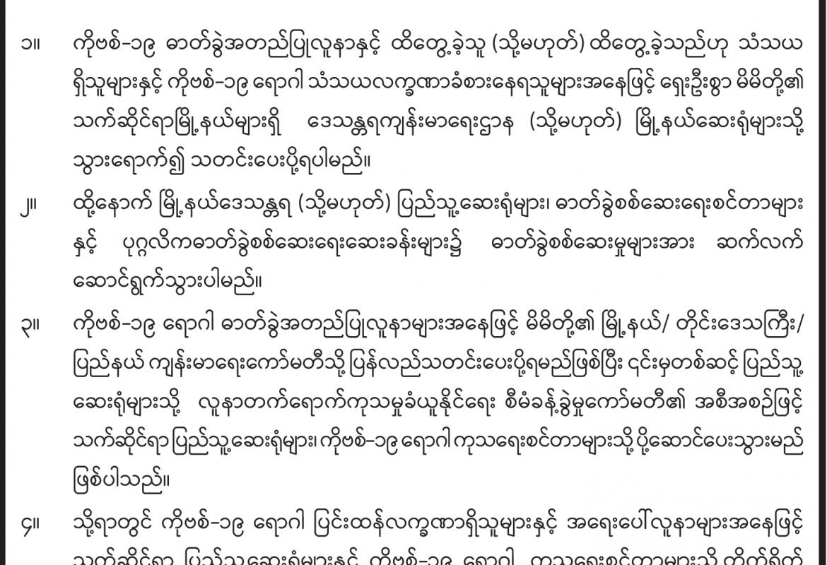 ကိုဗစ်-၁၉ ရောဂါ ဓာတ်ခွဲအတည်ပြုလူနာနှင့် ထိတွေ့ခဲ့သူများနှင့် ကိုဗစ်-၁၉ ရောဂါ သံသယရှိသူများအား ကျန်းမာရေးစောင့်ရှောက်ခံယူနိုင်ရန် စီစဉ်ထားရှိမှုပုံစံအား ရှင်းလင်းချက်