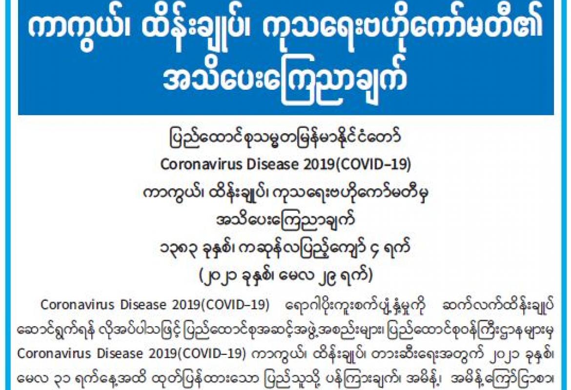 Coronavirus Disease 2016(COVID-19) ကာကွယ်၊ ထိန်းချုပ်၊ ကုသရေးဗဟိုကော်မတီ၏ အသိပေးကြေညာချက်