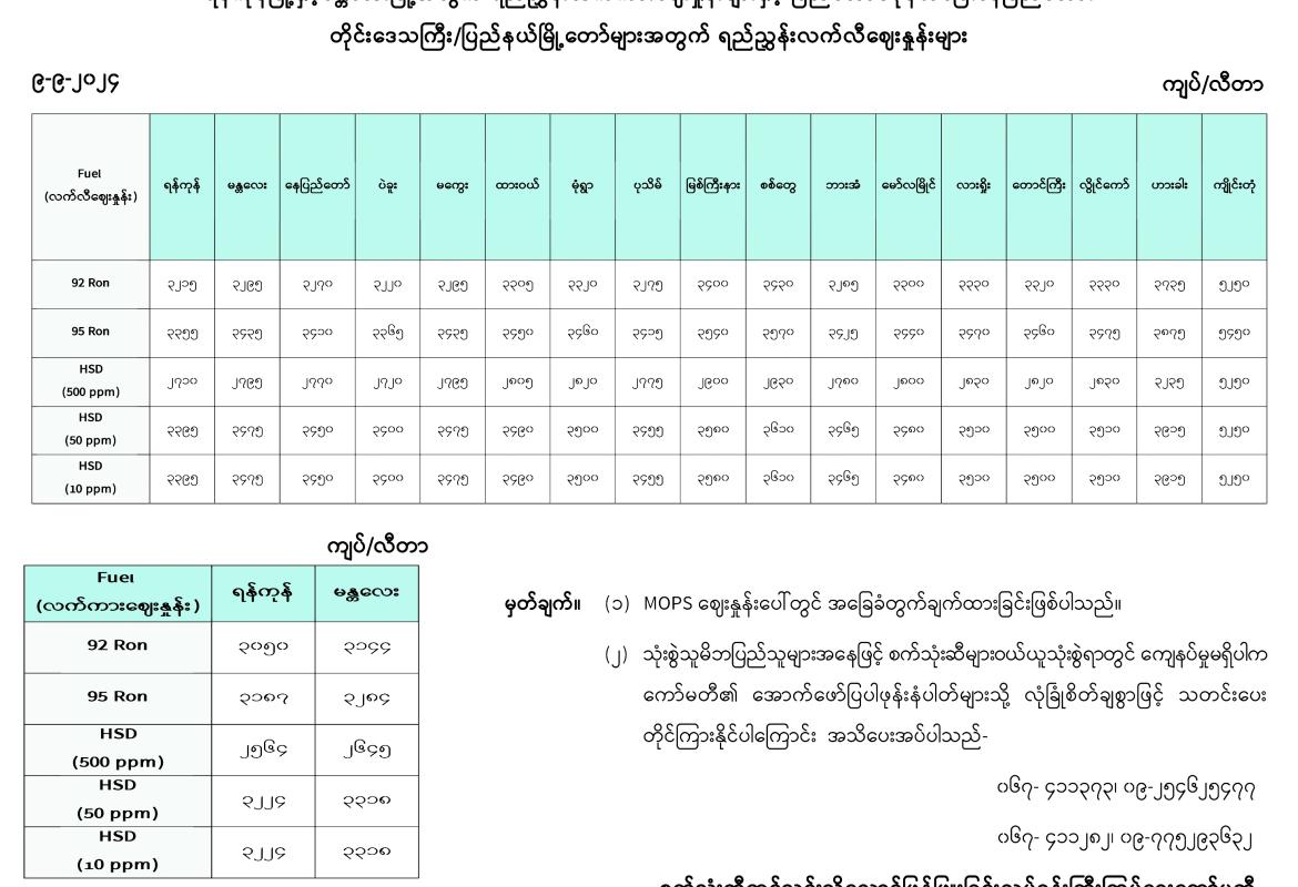 ရန်ကုန်မြို့နှင့် မန္တလေးမြို့အတွက် ရည်ညွှန်းလက်ကားဈေးနှုန်းများနှင့် ပြည်ထောင်စုနယ်မြေ နေပြည်တော်၊ တိုင်းဒေသကြီး/ ပြည်နယ် မြို့တော်များအတွက် ရည်ညွှန်းလက်လီဈေးနှုန်းများ