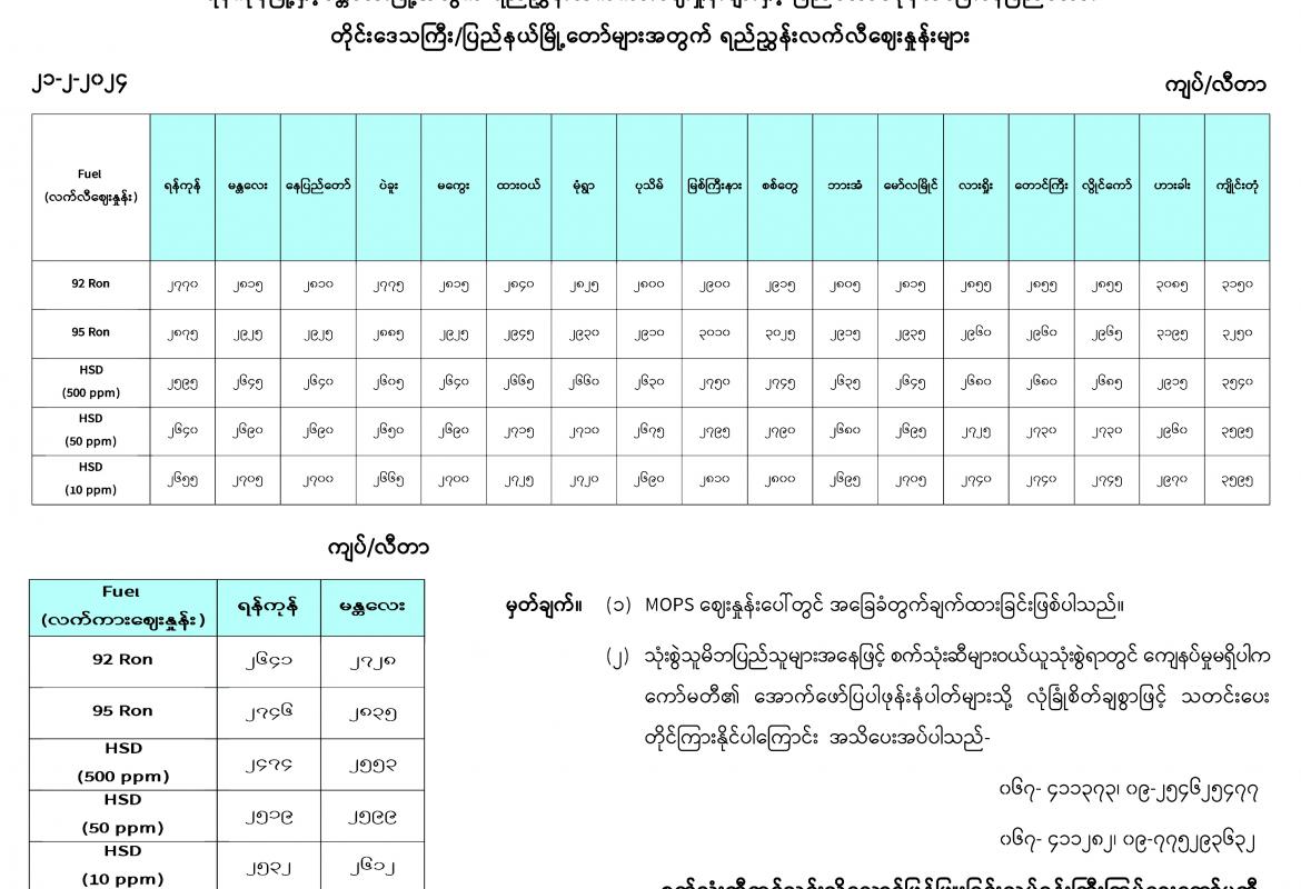 ရန်ကုန်မြို့နှင့် မန္တလေးမြို့အတွက် ရည်ညွှန်းလက်ကားဈေးနှုန်းများနှင့် ပြည်ထောင်စုနယ်မြေ နေပြည်တော်၊ တိုင်းဒေသကြီး/ပြည်နယ် မြို့တော်များအတွက် ရည်ညွှန်းလက်လီဈေးနှုန်းများ