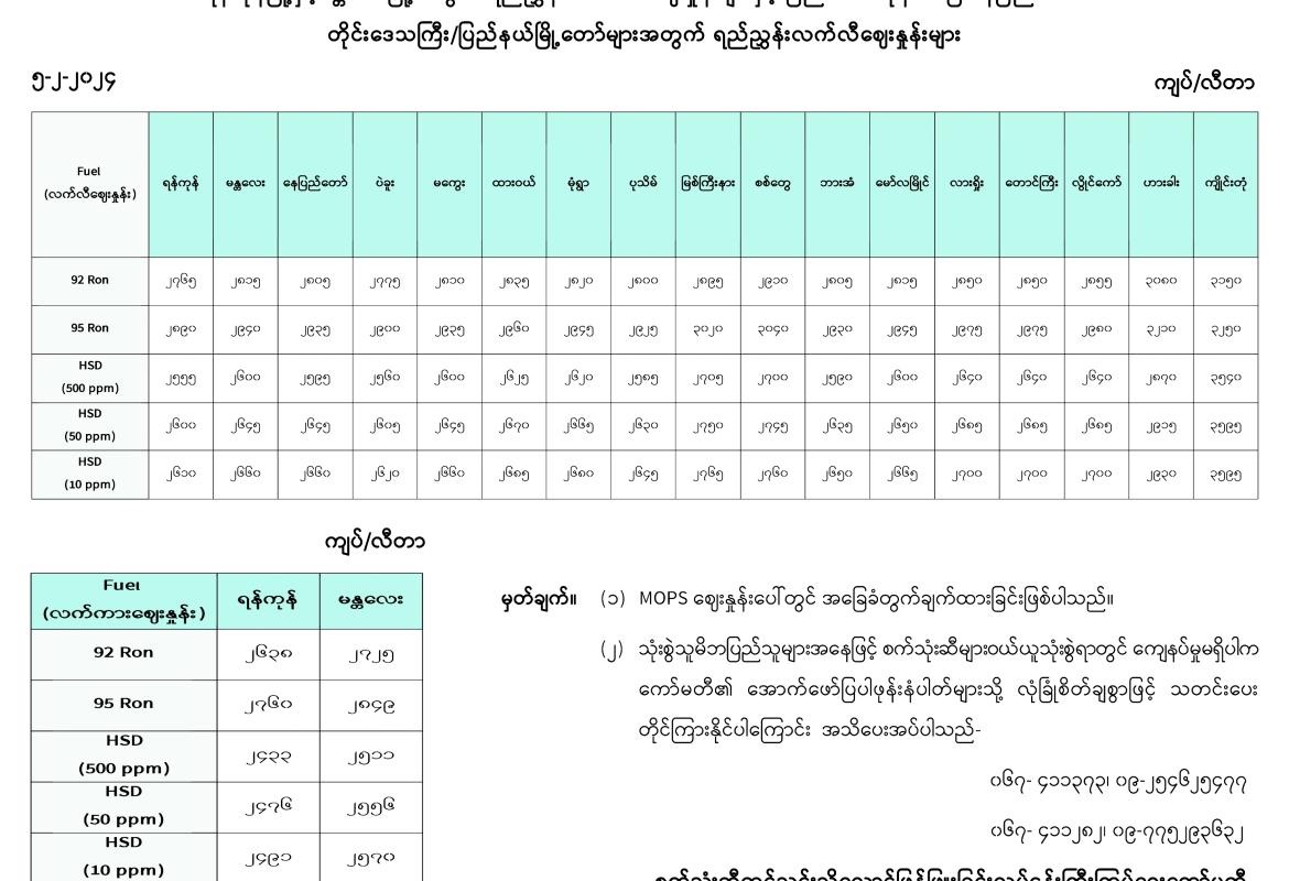 ရန်ကုန်မြို့နှင့် မန္တလေးမြို့အတွက် ရည်ညွှန်းလက်ကားဈေးနှုန်းများနှင့် ပြည်ထောင်စုနယ်မြေ နေပြည်တော်၊ တိုင်းဒေသကြီး/ ပြည်နယ် မြို့တော်များအတွက် ရည်ညွှန်းလက်လီဈေးနှုန်းများ