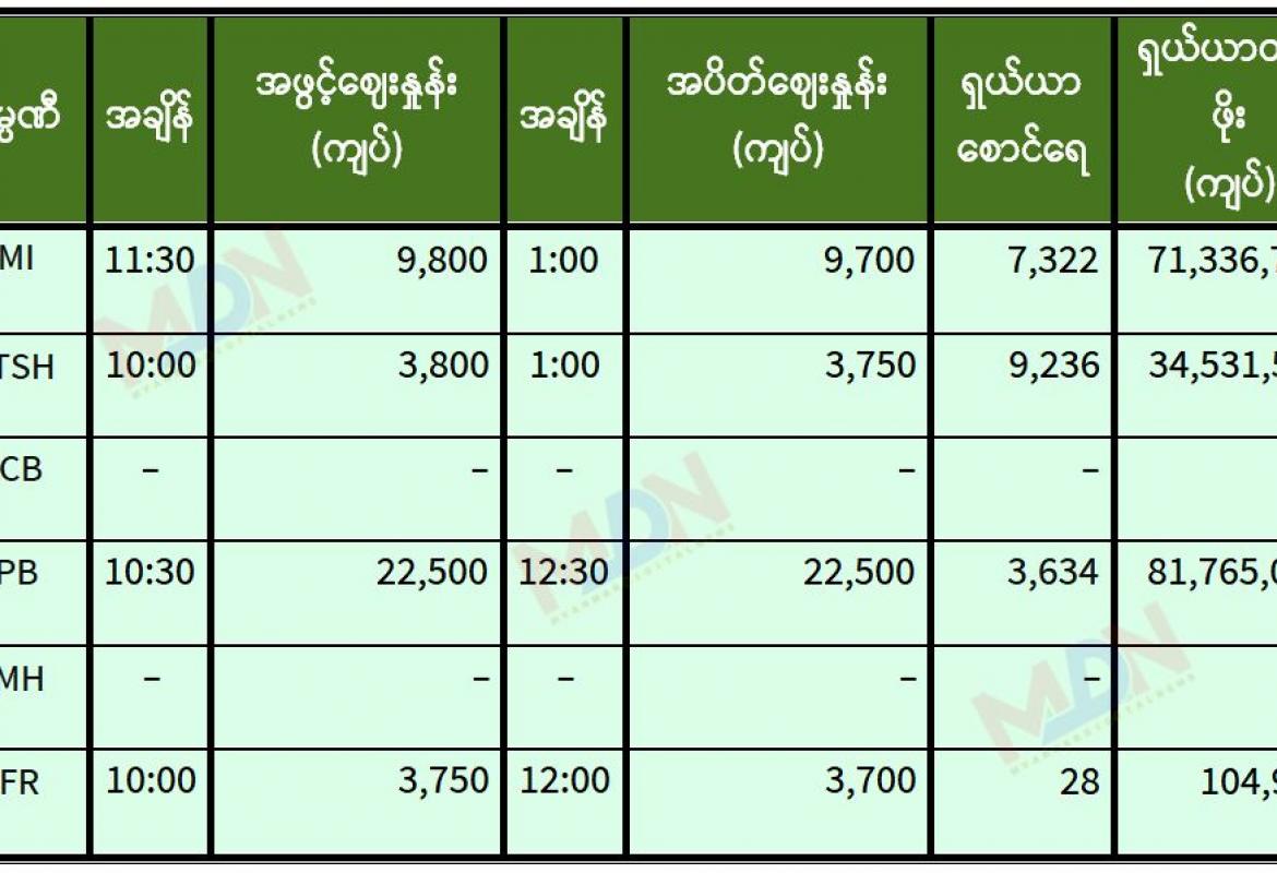 ဒီဇင်ဘာ ၂၁ ရက် ရန်ကုန်စတော့ အိတ်ချိန်းရှယ်ယာ အဖွင့်ဈေးနှုန်းများ