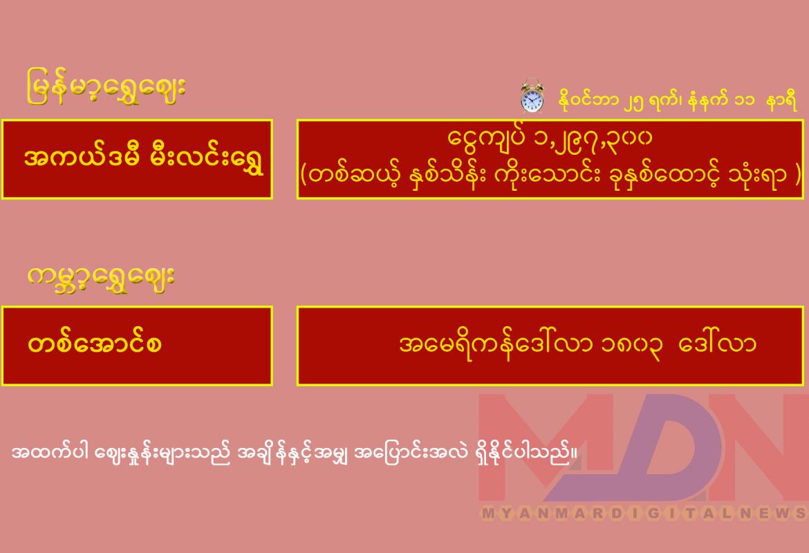 နိုဝင်ဘာ ၂၄ ရက် ရန်ကုန်စတော့ အိတ်ချိန်းရှယ်ယာ အပိတ်ဈေးနှုန်းများ